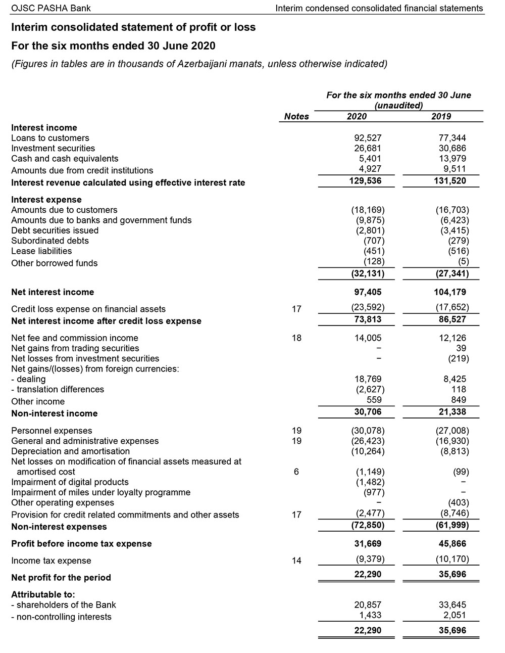 Marja hesabata istinadən xəbər verir ki, PAŞA Bank qrupu 2020-ci ilin 1-ci yarısını 22 milyon 290 min manat xalis mənfəət ilə başa vurub. Bu, 2019-cu ilin eyni dövrü ilə müqayisədə 13 milyon 406 min manat və ya 37,5% azdır. Qrup ötən ilin 1-ci yarısını 35 milyon 696 min manat xalis mənfəət ilə bağlamışdı.