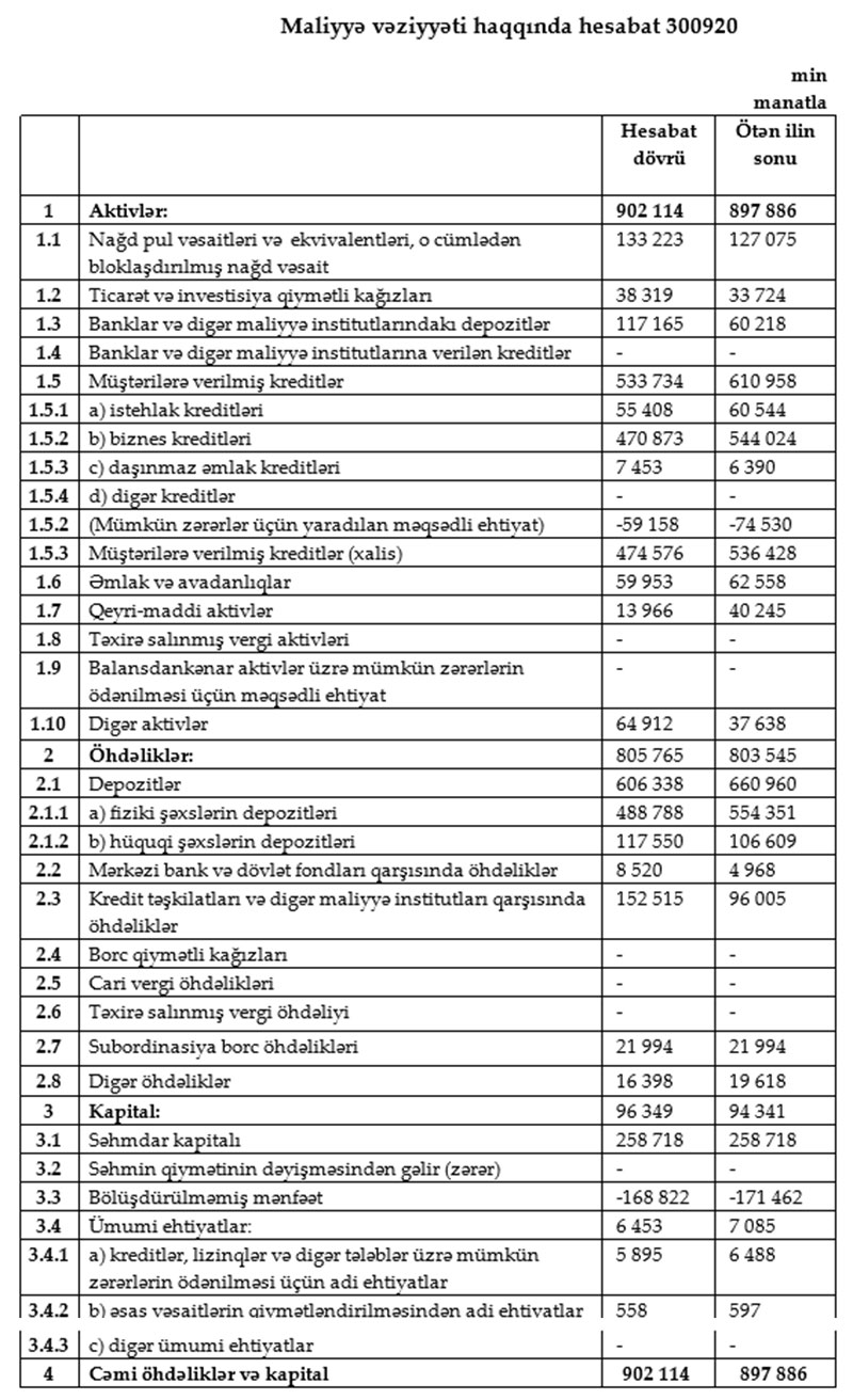 "Üçüncü rübün sonunda Bankın aktivləri 902.1 milyon manat təşkil edib.Eyni tarixə Bankın xalis kredit portfeli 474.6 milyon manat olub. Kreditlər üzrə mümkün zərərlərin ödənilməsi üzrə ehtiyatlar nəzərə alınmadan, Bankın portfeli 533.7 milyon manat təşkil edib. 9 ay ərzində Bankın balansındakı kredit portfelinin payı 63%-dən 55%-ə düşüb ki, bu da likvid aktivlərin payını artırıb və pandemiya kontekstində Bankın risklərini azaldıb.