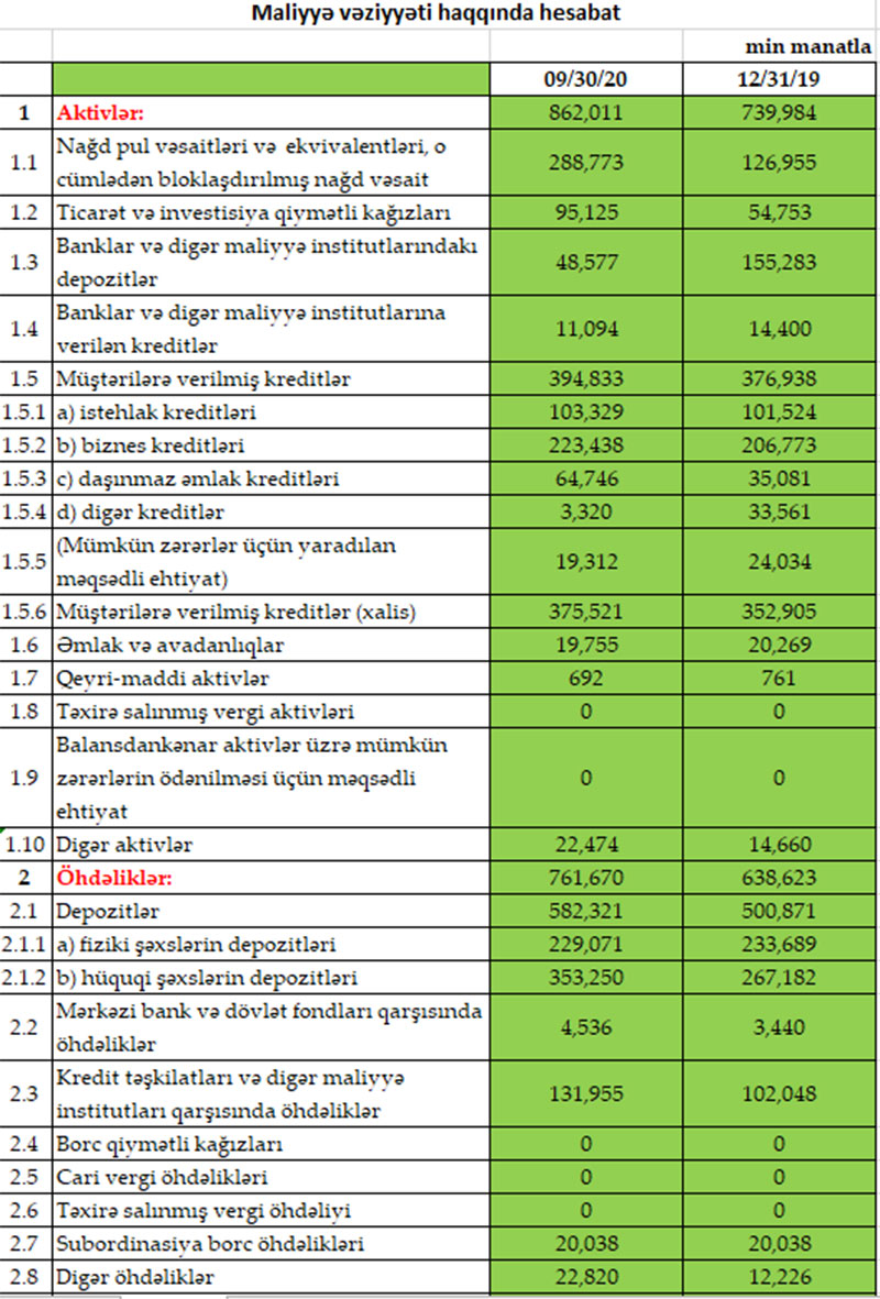 2019-cu ilin sonu ilə müqayisədə 2020-ci ilin 9 ayı ərzində Rabitəbankın cəmi aktivləri 122 milyon 27 min manat artaraq 862 milyon 11 min manata, o cümlədən müştərilərə verilmiş kreditlər 17 milyon 895 min manat artaraq 375 milyon 521 min manata çatıb.
