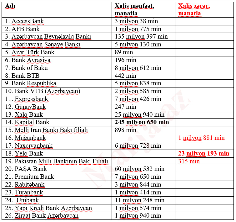 Ən çox mənfəət Kapital Bankda, ən çox zərər isə Yelo bankda qeydə alınıb.