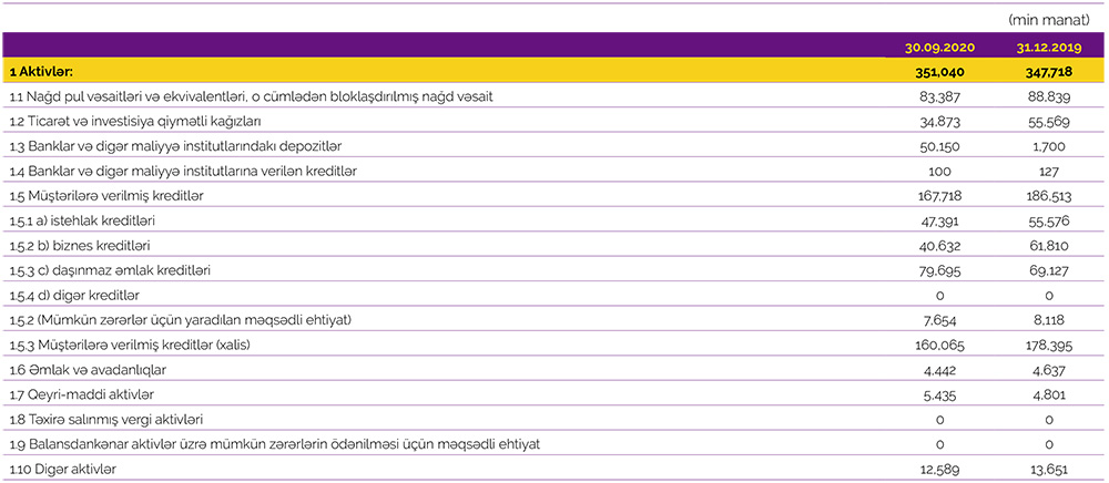 2020-ci ilin 9 ayı ərzində Azər-Türk Bankın cəmi aktivləri 3 milyon 322 min manat artaraq 30 Sentyabr 2020-ci il tarixində 351 milyon 40 min manata çatıb. Artım Azər-Türk Bankın digər banklara yatırdığı depozitləri 30 dəfəyə yaxın artıraraq 50 milyon 150 min manata çatdırması ilə əlaqədardır.