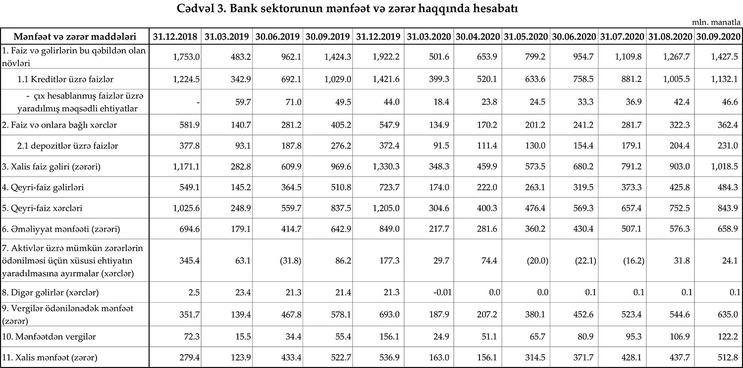 30 sentyabr 2020-ci il tarixinə olan bank sektorunun əsas göstəriciləri.