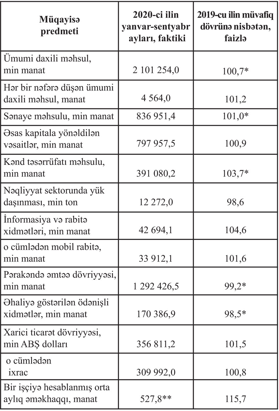 2019-cu ilin müvafiq dövrü ilə müqayisədə 2020-ci ilin yanvar-sentyabr aylarında sənaye məhsulu 1 faiz, əsas kapitala yönəldilən vəsaitlər 0,9 faiz, kənd təsərrüfatı məhsulu 3,7 faiz, informasiya və rabitə xidmətləri 4,6 faiz artmışdır.