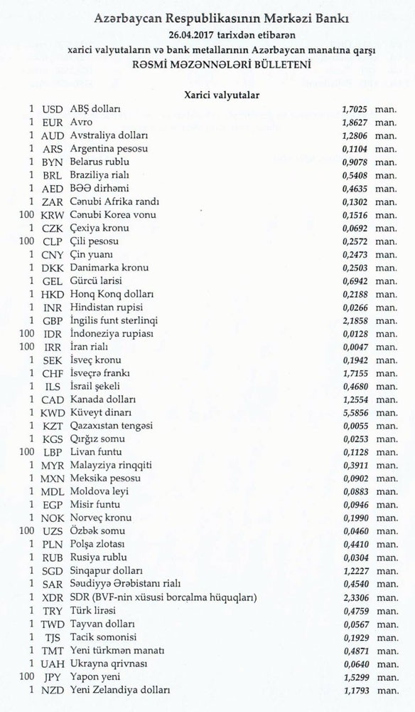 Aprelin 26-na Mərkəzi Bankın açıqladığı rəsmi Dollar/manat məzənnəsi Aprelin 25-i ilə müqayisədə qalxaraq 1,7025 manat olub, Avro/manat məzənnəsi isə 1.8627 manata qalxıb.
