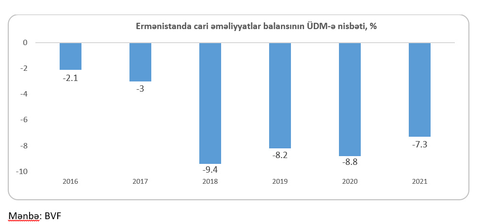 Ermənistanın cari əməliyyatlar hesabı kəsirinin ÜDM-ə nisbəti 8.2% -dir. 1991-ci ildən bəri davam edən bu kəsir xroniki xarakter daşıyır.
