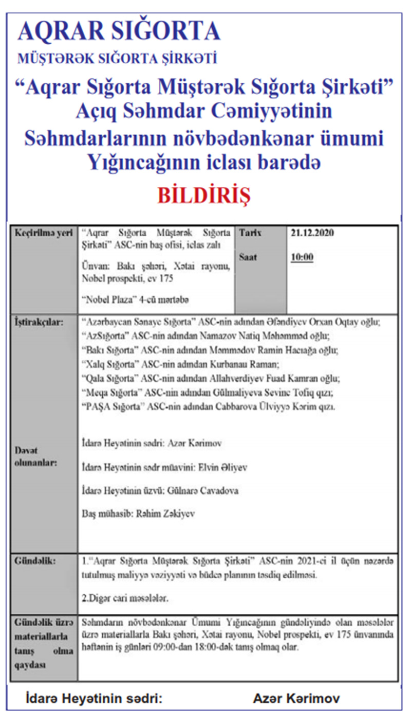Dekabrın 21-də, saat 10:00-da “Aqrar Sığorta Müştərək Sığorta Şirkəti” ASC-nin səhmdarlarının növbədənkənar ümumi yığıncağı keçiriləcək.
