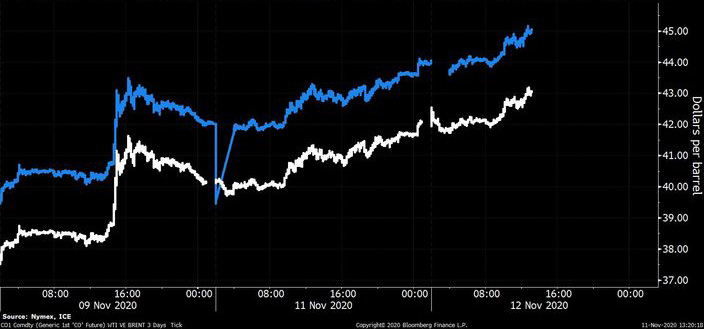 Neft qiymətləri, Joe Biden-in Preident seçilməsi və peyvənd xəbərləri ilə ötən iki gün ərzində 11%-dən çox yüksəlib.
