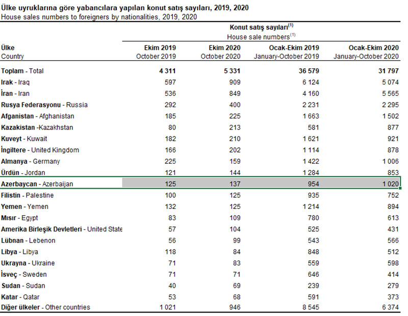2020-ci ilin Yanvar-Oktyabr dövründə (10 ayda) isə azərbaycanlılar Türkiyədə 1020 mənzil alıblar. 2019-cu ilin eyni dövründə bu say 954 idi.