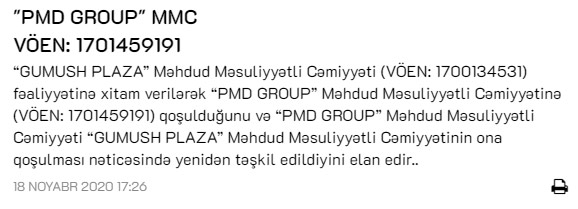 “Gumush Plaza” Məhdud Məsuliyyətli Cəmiyyətinin fəaliyyətinə xitam verilərək “PMD Group” Məhdud Məsuliyyətli Cəmiyyətinə qoşulub.