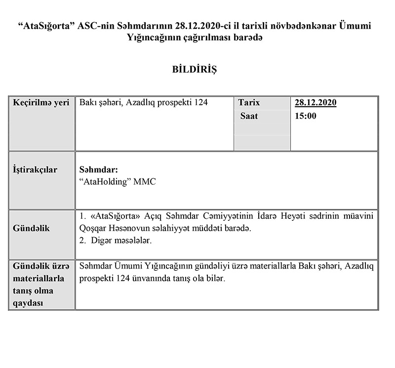 28.12.2020-ci il tarixində “AtaSığorta” ASC-nin səhmdarının növbədənkənar Ümumi Yığıncağı keçiriləcək.