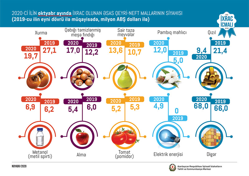 2020-ci ilin yanvar-oktyabr ayları ərzində ixrac edilən qeyri-neft sektoruna aid malların siyahısında tomat (pomidor 173 milyon ABŞ dolları) birinci, qızıl (sikkə kəsilməsində istifadə olunmayan, digər emal olunmamış formalarda - 158,7 milyon ABŞ dolları) ikinci və pambıq mahlıcı (94,7 milyon ABŞ dolları) üçüncü olub.