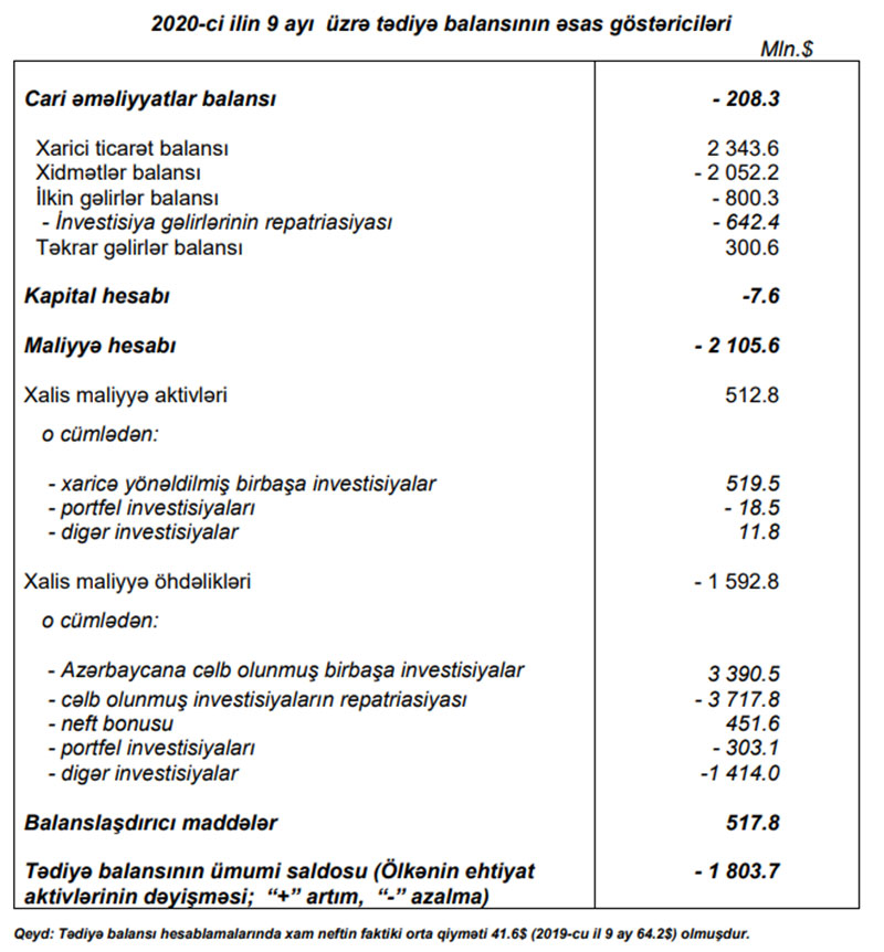 "2020-ci ilin 9 ayında tədiyə balansında birbaşa investisiyalar maddəsinin neft-qaz sektoru üzrə xalis maliyyə öhdəliklərinin (-509.7 mln.$) azalması cəlb olunmuş investisiya ilə (2893.4 mln.$) kapitalın repatriasiyası (3403.1 mln.$) arasındakı fərqdən formalaşır. Qiymətləndirmələrə görə qeyri-neft sektoruna cəlb olunmuş birbaşa investisiyaların ümumi məbləği 497.1 mln.$ (18% artım) olmuşdur", - məlumatda deyilir.