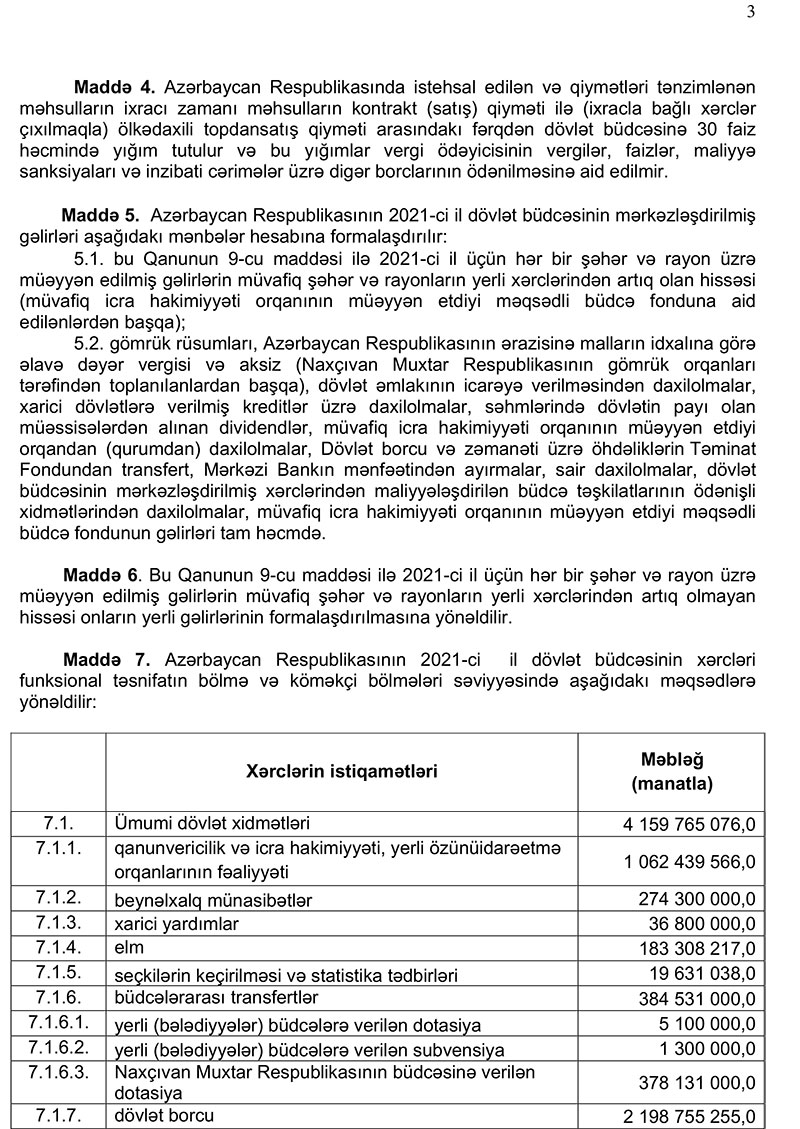 Maliyyə NAzirliyinin yaydığı məlumata görə, 2021-ci il dövlət və icmal büdcənin layihələri “Büdcə sistemi haqqında” Azərbaycan Respublikasının Qanunu, Azərbaycan Respublikasının Prezidenti İlham Əliyevin müəyyən etdiyi ölkənin qeyri-neft sektorunun davamlı və rəqabətqabiliyyətli inkişafı, habelə dövlətin iqtisadi siyasətinin prioritet istiqamətləri üzrə qarşıda duran vəzifələr əsas götürülməklə tərtib edilib.