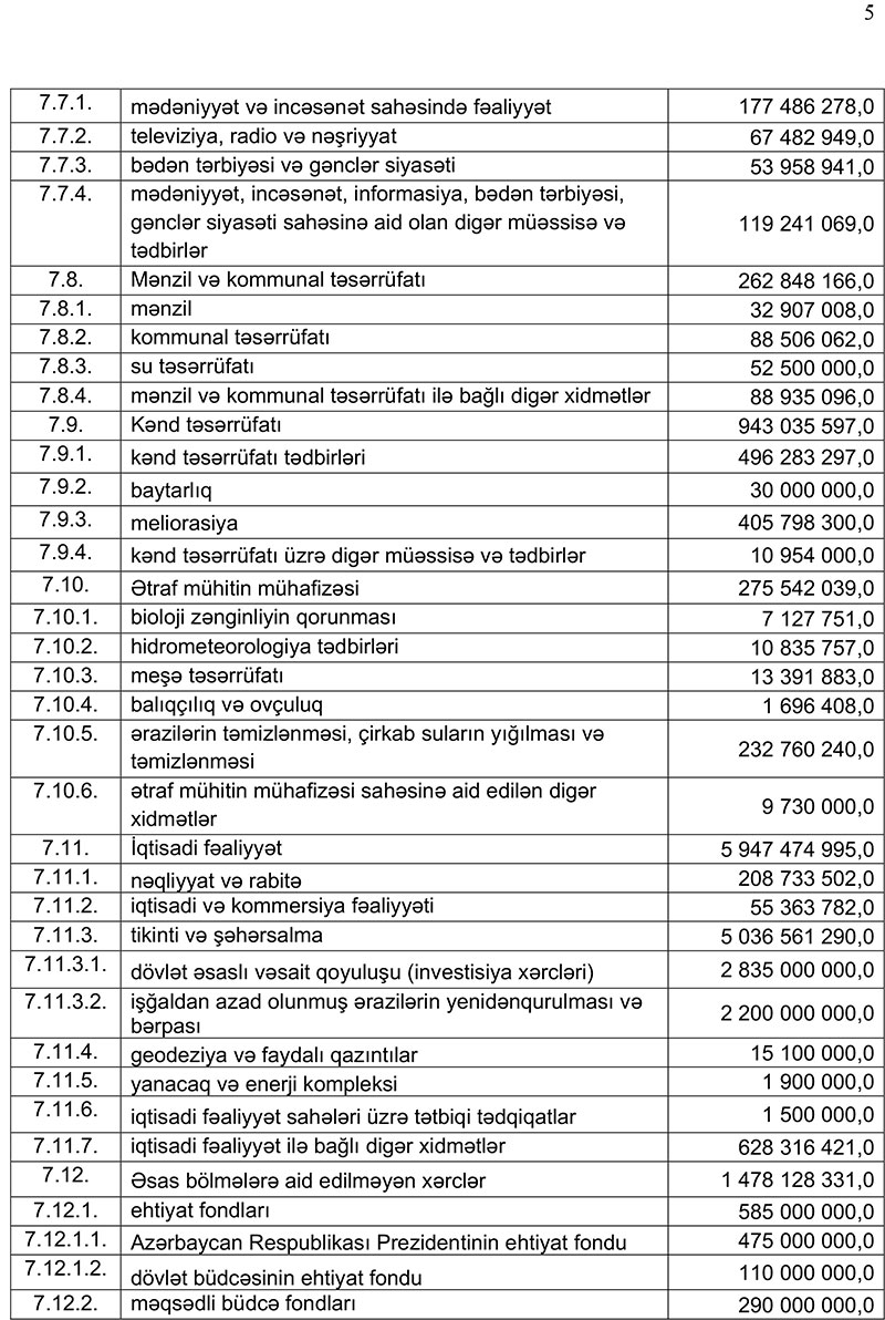 Növbəti ilin dövlət büdcəsinin xərclərinin strukturuna daxil olan cari xərclərə ümumi xərclərin 63,1 faizi həcmində və ya 18 milyard 14,0 milyon manat , əsaslı xərclərə 29,2 faizi həcmində və ya 8 milyard 330,3 milyon manat, dövlət borcuna xidmətlə bağlı xərclərə 7,7 faizi həcmində və ya 2198,8 milyon manat vəsait yönəldiləcəkdir.