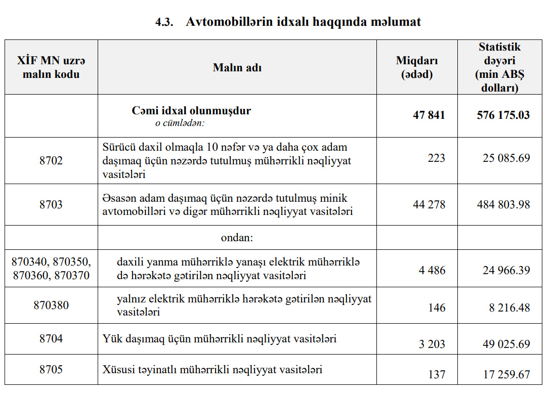 Cari ilin 11 ayında ayda ölkəmizə 44 min 278 ədəd minik avtomobili, 223 ədəd avtobus, 3 min 203 ədəd yük avtomobili və 137 ədəd xüsusi təyinatlı avtomobil idxal edilib.