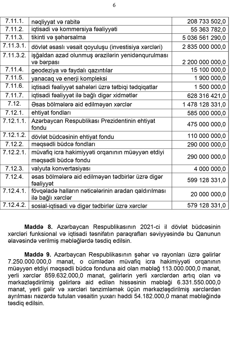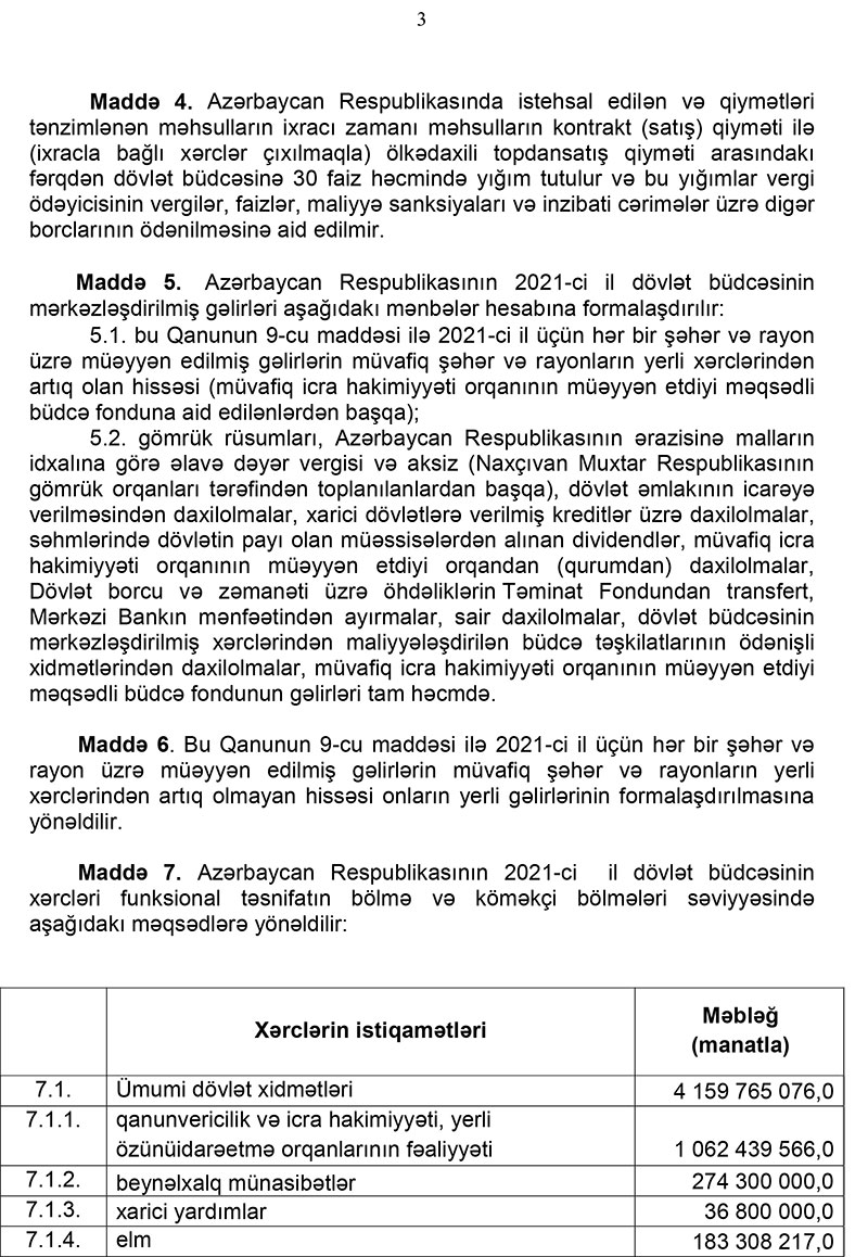 Azərbaycan Prezidenti İlham Əliyev "Azərbaycan Respublikasının 2021-ci il dövlət büdcəsi haqqında Azərbaycan Respublikasının Qanunu" imzalayıb.