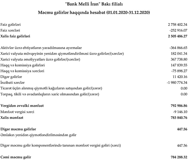 "Bank Melli İran" Bakı filialı 2020-ci ili 784 min 288 manat xalis mənfəət ilə başa vurub. Halbuki, Bank 2019-cu ili 16 milyon 555 min 647 manat xalis zərər ilə bağlamışdı.