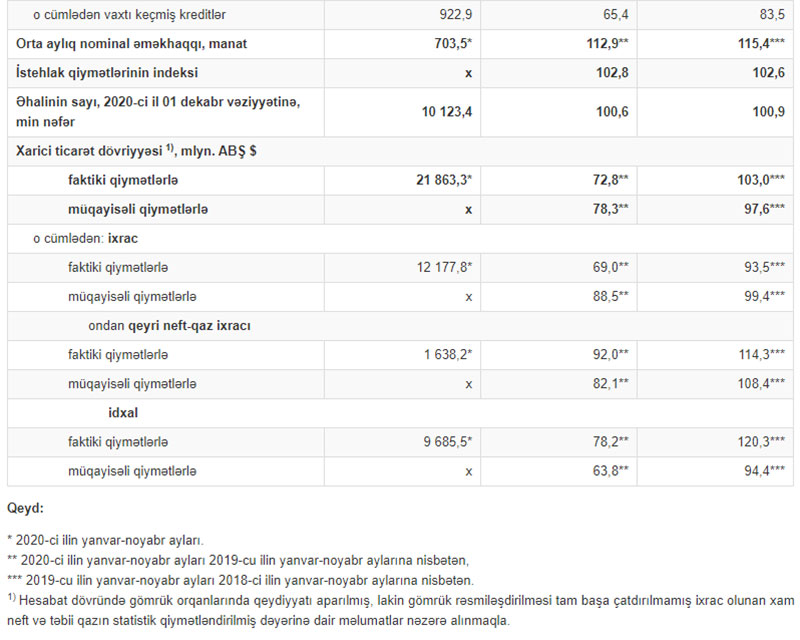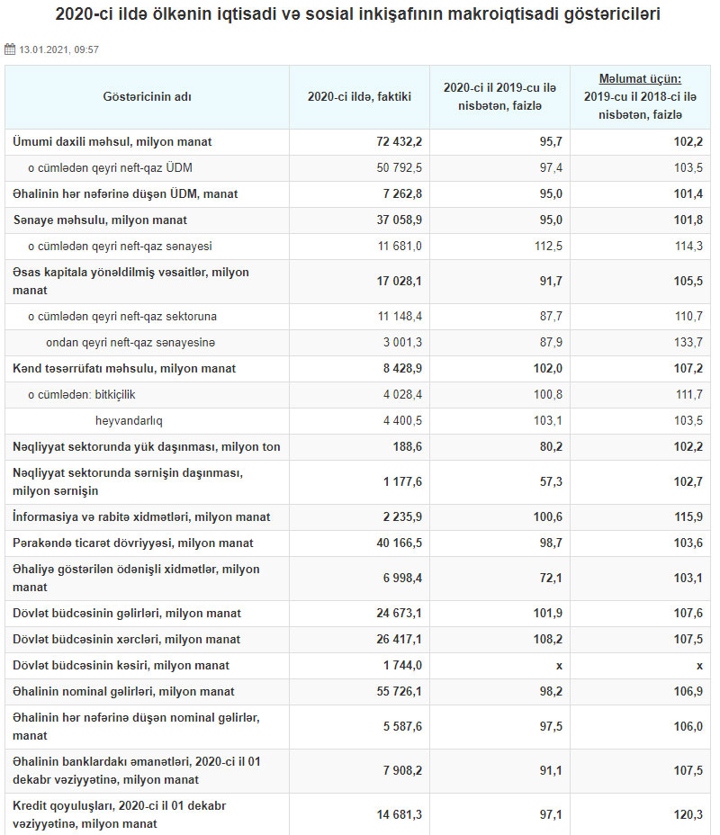 2020-ci ildə ölkənin iqtisadi və sosial inkişafının makroiqtisadi göstəriciləri açıqlanıb.