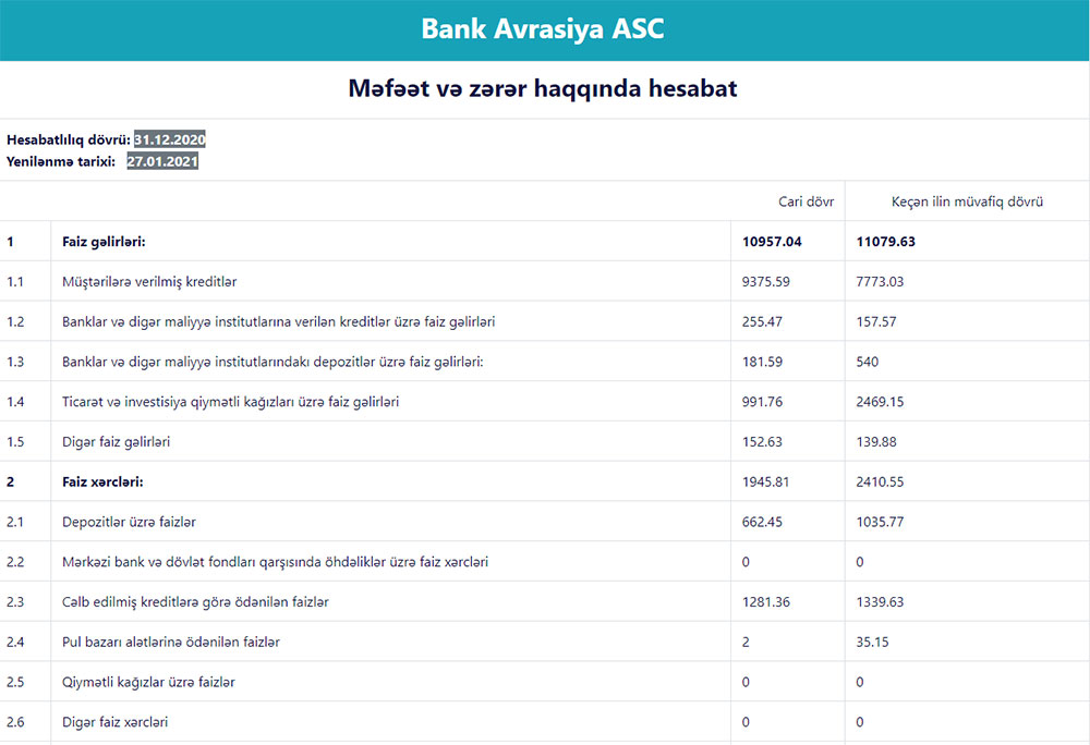Xatırladaq ki, 2019-cu ildə "Bank Avrasiya"nın cəmi gəlirləri 12 milyon 887 min manat, cəmi xərcləri 7 milyon 607 min manat, əməliyyat mənfəəti isə 5 milyon 280 min manat təşkil etmişdi. Eyni zamanda həmən il "Mümkün zərərlər üçün yaradılan məqsədli ehtiyatlardan" azad olmuş 1 milyon 432 min manat mənfəətə əlavə edilmişdi. Bank 6 milyon 713 min manat mənfəətindən 1 milyon 356 min manat mənfəət vergisi ödəmiş və 2019-cu ili 5 milyon 356 min manat xalis mənfəət ilə bağlamışdı.