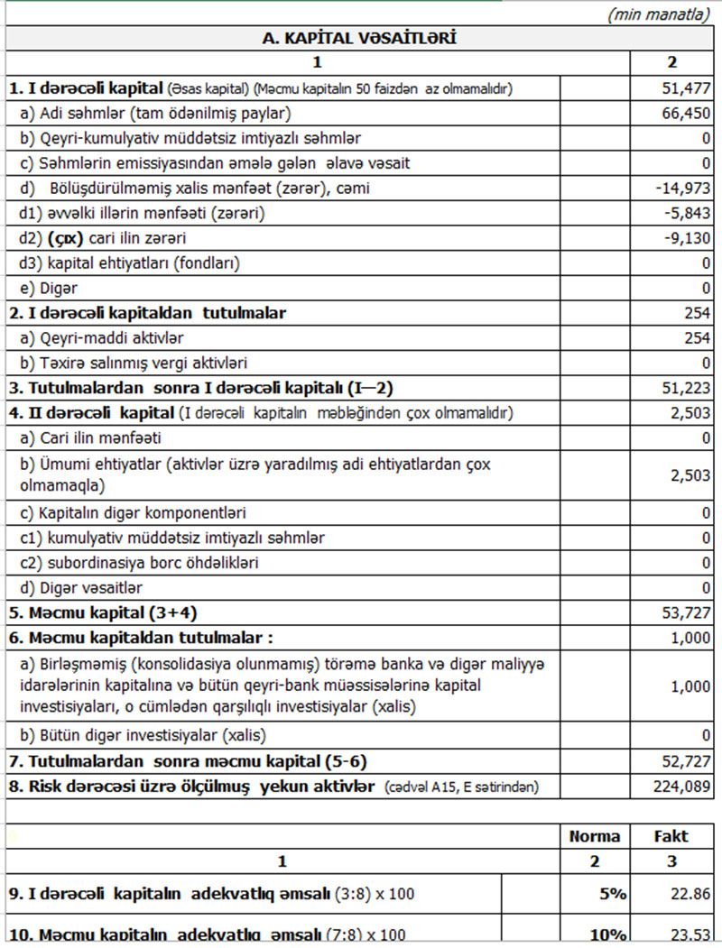 Bankın əsas dayanıqlıq göstəricilərindən olan məcmu kapitalın adekvatlıq əmsalı 23.5% təşkil edir ki, bu isə təyin olunmuş normaya nisbətdə 2 dəfədən çox artıqdır. Qeyd olunan məlumatlardan aydın olur ki, bank inkişafı üçün kifayət qədər yüksək kapital ehtiyatına malikdir.