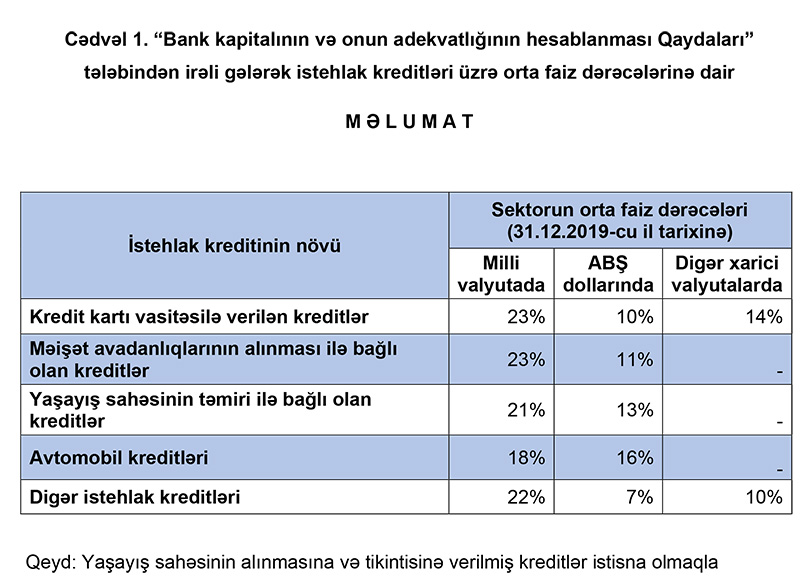 Mərkəzi Bank ötən dəfə kəskin faiz endirməsinə baxmayaraq Azərbaycanda istehlak kreditləri üzrə orta faizlər açıqlandıMərkəzi Bank “Bank kapitalının və onun adekvatlığının hesablanması Qaydaları” tələbindən irəli gələrək istehlak kreditləri üzrə orta faiz dərəcələrinə dair məlumat yayıb.