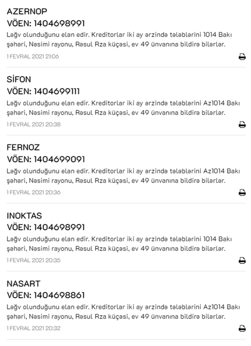Azərbaycanda eyni hüquqi ünvanda dövlət qeydiyyatına alımış “Azernop”, “Sifon”, “Fernoz”, “Inoktas” və “Nasart” MMC-lər ləğv olunduğunu elan edib.