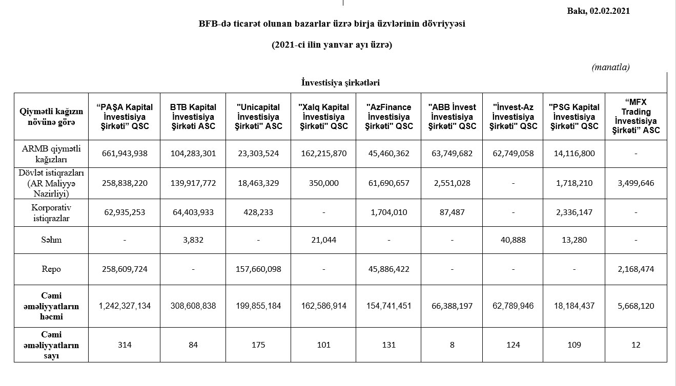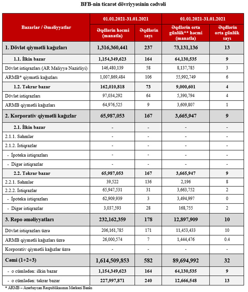 2021-ci ilin yanvar ayı ərzində Bakı Fond Birjasında qiymətli kağızlar üzrə keçirilən əməliyyatların ümumi həcmi 1 milyard 614 milyon 509 min 853 manat təşkil etmişdir. Bu barədə Marja-ya Birjadan bildirilib.