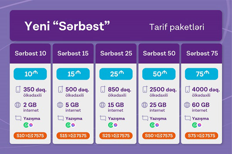 Azercell müştərilərinə Sərbəst 10 tarifi çərçivəsində ayda cəmi 10 AZN ödəməklə 2GB internet və 350 ölkədaxili dəqiqə; Sərbəst 15 tarifində ayda 15 AZN-ə 5 GB internet və 500 ölkədaxili dəqiqə; Sərbəst 25 tarifində ayda 25 AZN-ə 15 GB internet və 850 ölkədaxili dəqiqə; Sərbəst 50 tarifində ayda 50 AZN-ə 25 GB internet və 2500 ölkədaxili dəqiqə; Sərbəst 75 tarifində ayda 75 AZN-ə 60 GB internet və 4000 ölkədaxili dəqiqə təklif edir.