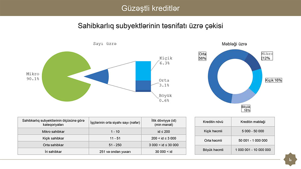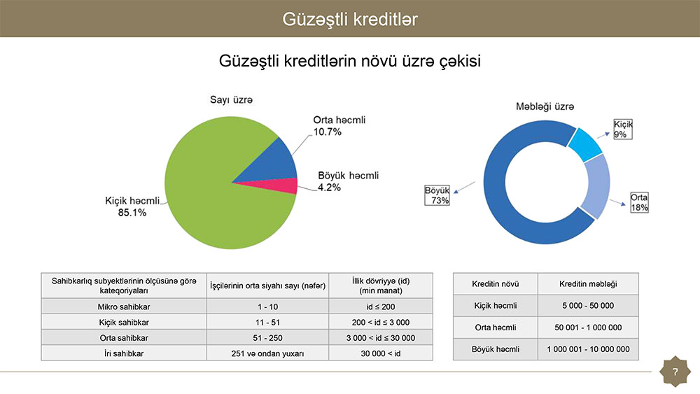 Say üzrə ən çox güzəştli kreditlər mikro sahibkarlıq subyektlərinə ayrılıb (say üzrə güzəştli kreditlərin 90,1%-i). Say üzrə güzəştli kreditlərin 6.3%-i kiçik, 3.1%-i orta və 0,6%-i böyük biznesə verilib.