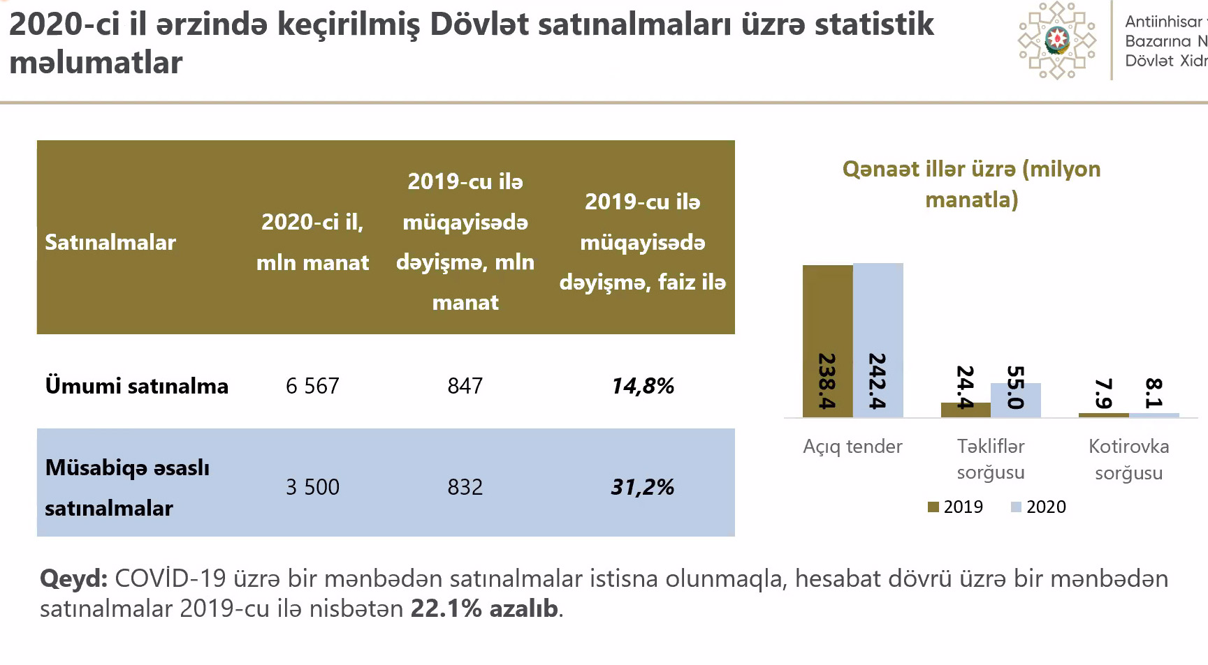 2020-ci ildə ümumi dövlət satınalmalarının həcmi 6 milyard 567 milyon manat, o cümlədən müsabiqə əsasalı satınalmaların həcmi 3 milyard 500 milyon manat təşkil edib.