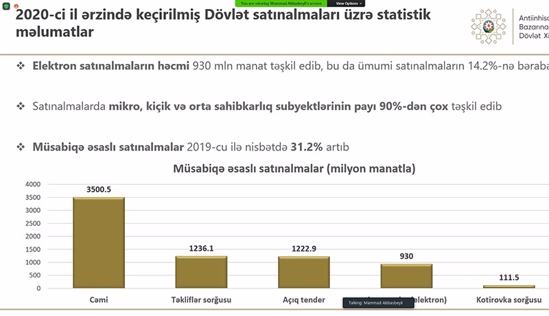 Onun təqdimatına görə, 2019-cu illə müqayisədə 2020-ci ildə ümumi dövlət satınalmalarının həcmi 847 milyon manat vəya 14,8%, o cümlədən müsabiqə əsasalı satınalmaların həcmi isə 832 milyon manat və ya 31,2% artıb.
