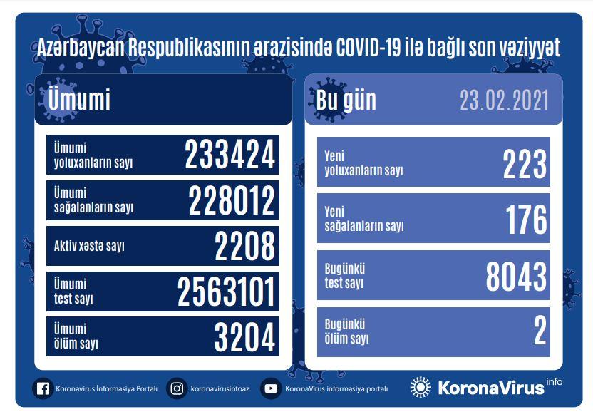 Azərbaycanda son sutkada koronavirus infeksiyasına 223 yeni yoluxma faktı qeydə alınıb, 176 nəfər müalicə olunaraq sağalıb və evə buraxılıb.