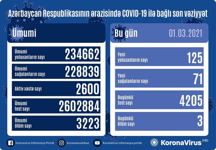 Azərbaycan Respublikasında koronavirus (COVID-19) infeksiyasına 125 yeni yoluxma faktı qeydə alınıb, 71 nəfər müalicə olunaraq sağalıb.
