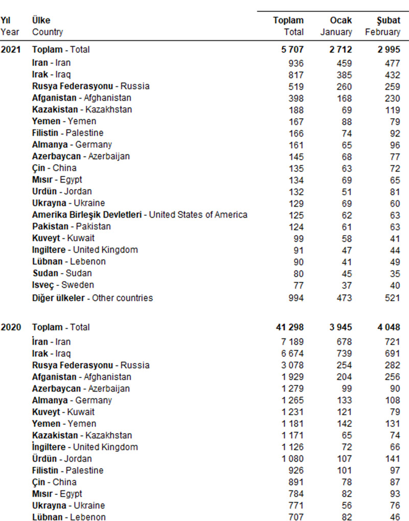 2021-ci ilin yanvar-fevral aylarında azərbaycanlılar Türkiyədə 145 mənzil alıblar. 2020-cu ilin eyni dövründə azərbaycanlılar Türkiyədə 189 mənzil almışdılar.