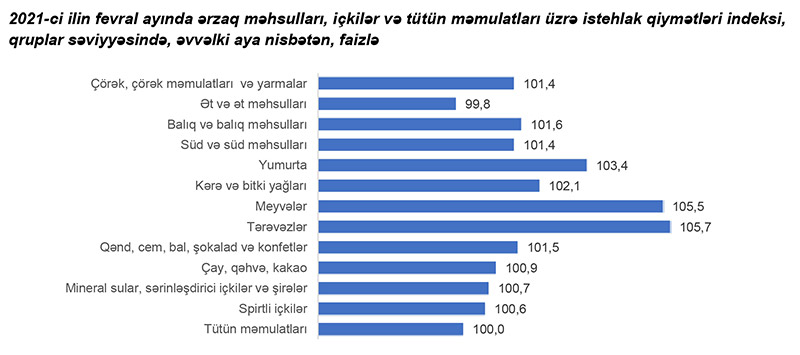 2021-ci ilin fevral ayında ərzaq məhsulları, içkilər və tütün məmulatları üzrə istehlak qiymətləri indeksi əvvəlki aya nisbətən 2,1 faiz, əvvəlki ilin fevral ayına nisbətən 5,2 faiz artmışdır.