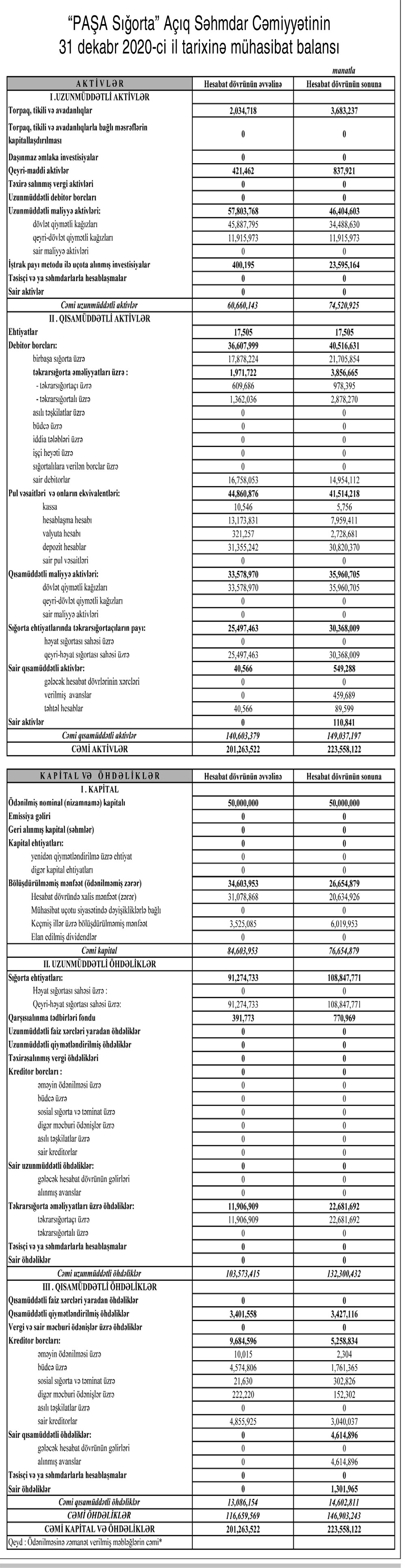 “PAŞA Sığorta” ASC 2020-ci ili 20 milyon 635 min manat xalis mənfəət ilə başa vurub. Halbuki, şirkət 2019-cu ili 31 milyon 78 min manat xalis mənfəət ilə bağlamışdı. Xalis mənfəətin azalması sığorta ödənişlərinin, təkrarsığortaya verilmiş sığorta haqlarının və işlərin aparılması xərclərinin artmasından qaynaqlanır.