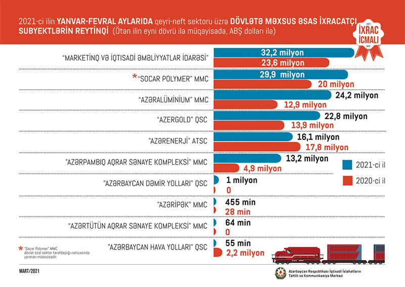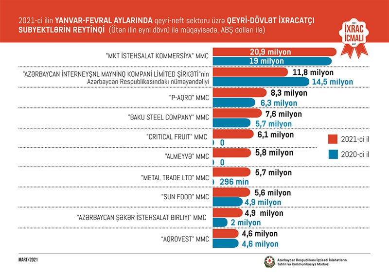 Marja xəbər verir ki, “İxrac İcmalı”-nın 2021-ci ilin yanvar-fevral ayları üzrə hazırlanan qeyri-dövlət ixracatçı subyektlərin reytinqində ilk onluqda aşağıdakı şirkətlər təmsil olunurlar: "MKT İstehsalat Kommersiya" MMC, "Azərbaycan İnterneyşnl Mayninq Kompani Limited Şirkəti"nin Azərbaycan Respublikasındakı nümayəndəliyi, "P-Aqro" MMC, "Baku Steel Company MMC", "Critical Fruit" MMC, "Almeyvə" MMC, "Metal Trader LTD" MMC, "Sun Food" MMC, "Azərbaycan Şəkər İstehsalat Birliyi" MMC və “Aqrovest” MMC.