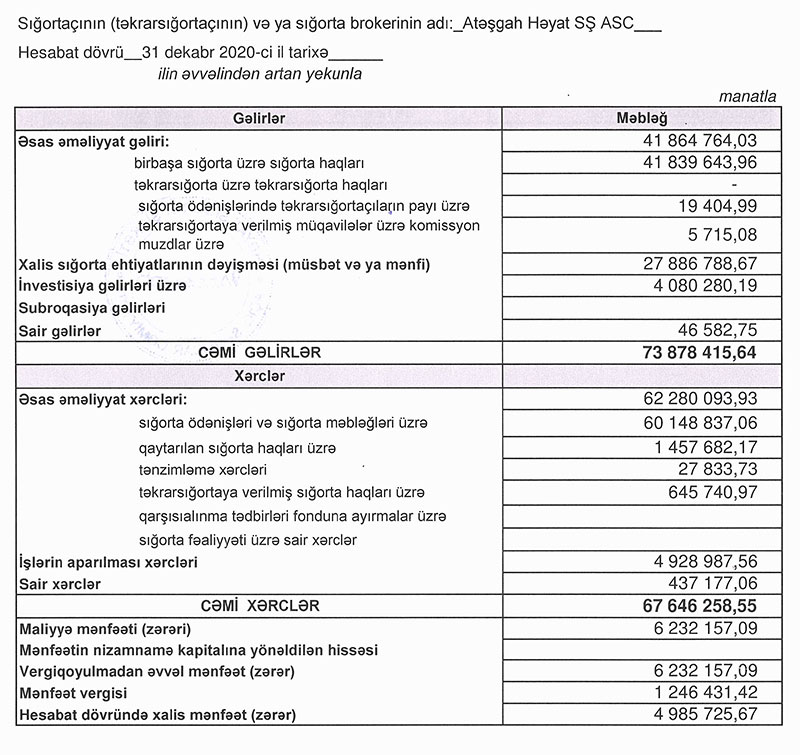 Marja şirkətin maliyyə heabatlarına istinadən xəbər verir ki, “Atəşgah Həyat” Sığorta Şirkətinin 2019-cu ildə 36 milyon 942 min manat təşkil etmiş cəmi əməliyyat gəlirləri 2020-ci ildə 73 milyon 878 min manata yüksəlib (2 dəfə artıb). Artım əsasən xalis sığorta ehtiyatlarının müsbətə dəyişməsindən qaynaqlanır.