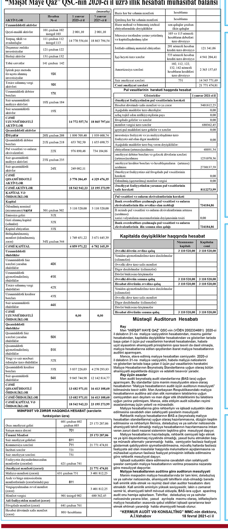 Şirkət 01 yanavar 2021-ci il tarixində 23 milyon 195 min manat cəmi balansa malik olub. 01 Yanvar 2020-ci il tarixində şirkət 18 milyon 542 min manat cəmi balansa malik idi.