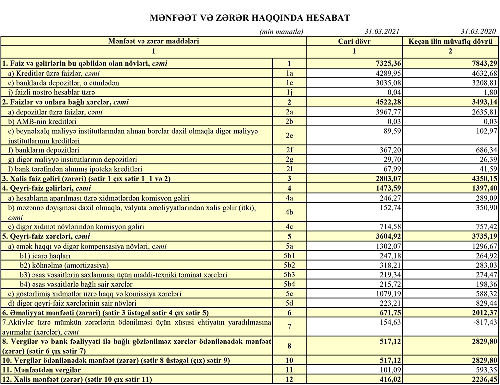 Müqayisə üçün qeyd edək ki, 2020-ci ilin yanvar-mart dövründə "Azərbaycan Sənaye Bankı"nın cəmi əməliyyat gəlirlləri 9 milyon 240 min manat, cəmi əməliyyat xərcləri 7 milyon 228 min manat, əməliyyat mənfəəti 2 milyon 12 min manat təşkil etmişdi. Eyni zamanda ehtiyatdan azad olmuş 817 min manat mənfəətə əlavə edilmişdi.