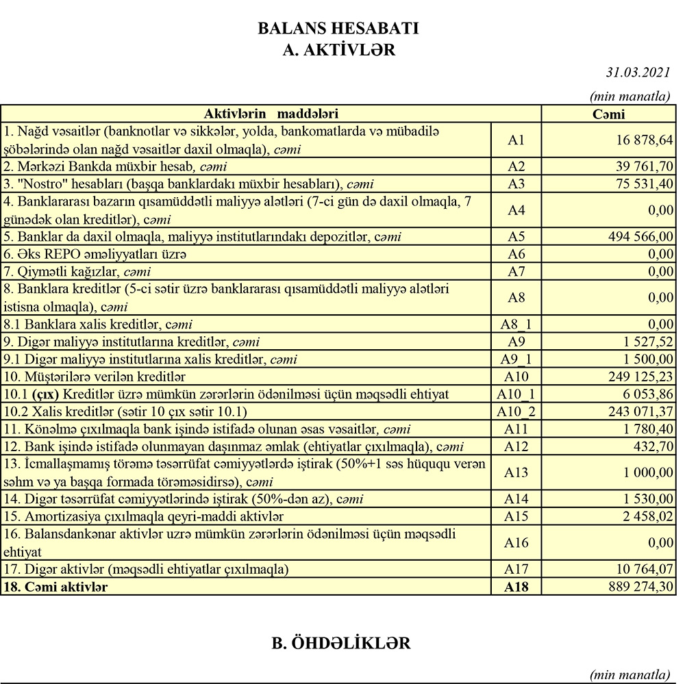 31 Mart 2021-ci il tarixində "Azərbaycan Sənaye Bankı" 889 milyon 274 min manat cəmi aktivlərə, o cümlədən 249 milyon 125 min manat kredit portfelinə (müştərilərə verilən kreditlər) və 494 milyon 566 min manat digər banklarda yerləşdirdiyi depozitlərə malik olub. Müqayisə üçün qeyd edək ki, Bank ötən ilin sonunda 911 milyon 504 min manat cəmi aktivlərə, o cümlədən 316 milyon 991 min manat kredit portfelinə və 444 milyon 38 min manat digər banklarda yerləşdirdiyi kreditlərə malik idi.