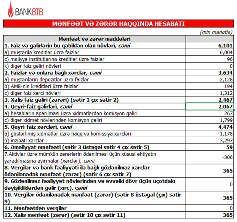 Bank “BTB” ASC 2021-ci ilin 1-ci rübünü 365 min manat xalis mənfəət ilə başa vurub. Bank 2020-ci ilin 1-ci rübünü 762 min manat xalis mənfəət ilə bağlamışdı.
