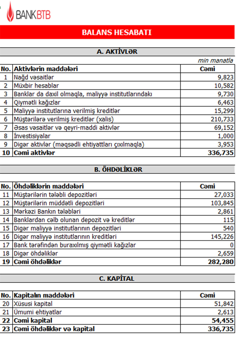 Müqayisə üçün qeyd edək ki, 2020-ci ilin 1-ci rübündə Bank “BTB”nin cəmi əməliyyat gəlirləri 7 milyon 984 min manat, cəmi əməliyyat xərcləri 7 milyon 56 min manat, əməliyyat mənfəəti 928 min manat təşkil etmişdi. Bank əməliyyat mənfəətindən 166 min manat aktivlər üzrə mümkün zərərlərin ödənilməsi üçün yaradılan xüsusi ehtiyata ayırmış və həmin dövrü 762 min manat xalis mənfəət ilə bağlamışdı.