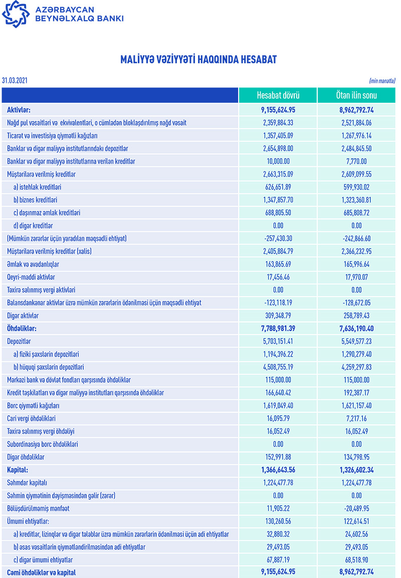 31 mart 2021-ci il tarixində “Azərbaycan Beynəlxalq Bankı” tutulmalardan sonra 1 milyard 149 milyon 870 min manat məcmu kapitala malik olub.