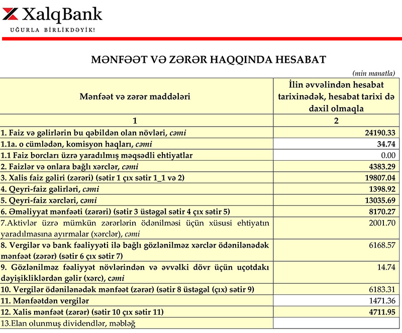 Müqayisə üçün qeyd edək ki, 2020-ci ilin 1-ci rübündə Xalq Bankın cəmi əməliyyat gəlirləri 35 milyon 448 min manat, cəmi əməliyyat xərcləri 19 milyon 38 min manat, əməliyyat mənfəəti 16 milyon 410 min manat, aktivlər üzrə mümkün zərərlərin ödənilməsi üçün xüsusi ehtiyatın yaradılmasına ayırması 5 milyon 441 min manat, ödədiyi mənfəət vergisi 1 milyon 928 min manat, xalis mənfəəti 9 milyon 44 min manat təşkil etmişdi.