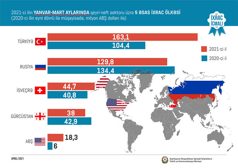 2021-ci ilin birinci rübü ərzində Türkiyəyə 163,1 milyon, Rusiyaya 129,8 milyon, İsveçrəyə 44,7 milyon, Gürcüstana 38 milyon və ABŞ 18,3 milyon ABŞ dolları dəyərində qeyri-neft sektoruna aid mal ixrac olunub.