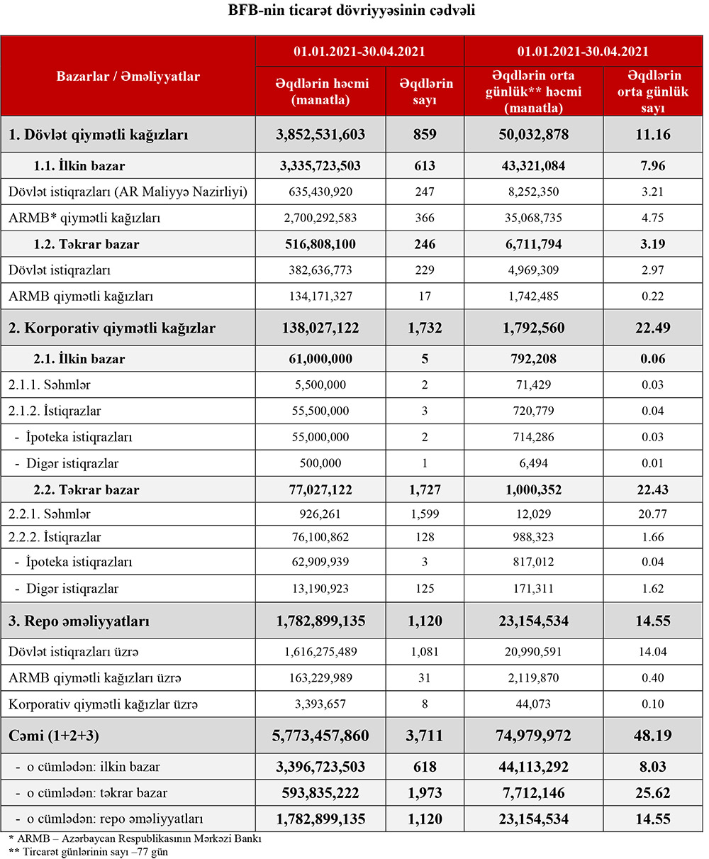 2021-ci ilin aprel ayının son ticarət günü üzrə Bakı Fond Birjasının kapitalizasiyası ilin əvvəlinə nisbətən 9% artaraq 4 milyard 221 milyon 379 min 674 manat təşkil etmişdir.