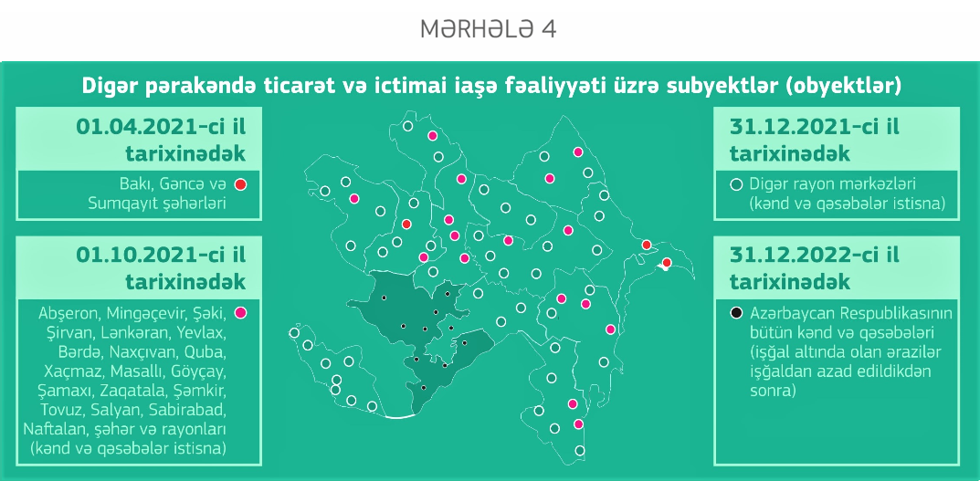 Sonuncu mərhələnin qrafikinə əsasən, Bakı, Sumqayıt və Gəncə şəhərlərində pərakəndə ticarət və ictimai iaşə fəaliyyəti üzrə subyektlər bu ilin 1 aprel tarixinədək e-kassanın tətbiqini başa çatdırmalı idilər. Lakin araşdırmalar göstərir ki, hələ də bir sıra sahibkarlar ənənəvi kassalardan istifadə edir. Qeyd edək ki, nəzərdə tutulan müddətədək e-kassalardan istifadəyə keçməyən sahibkarlar, qanunvericiliyə uyğun olaraq cərimələnirlər.