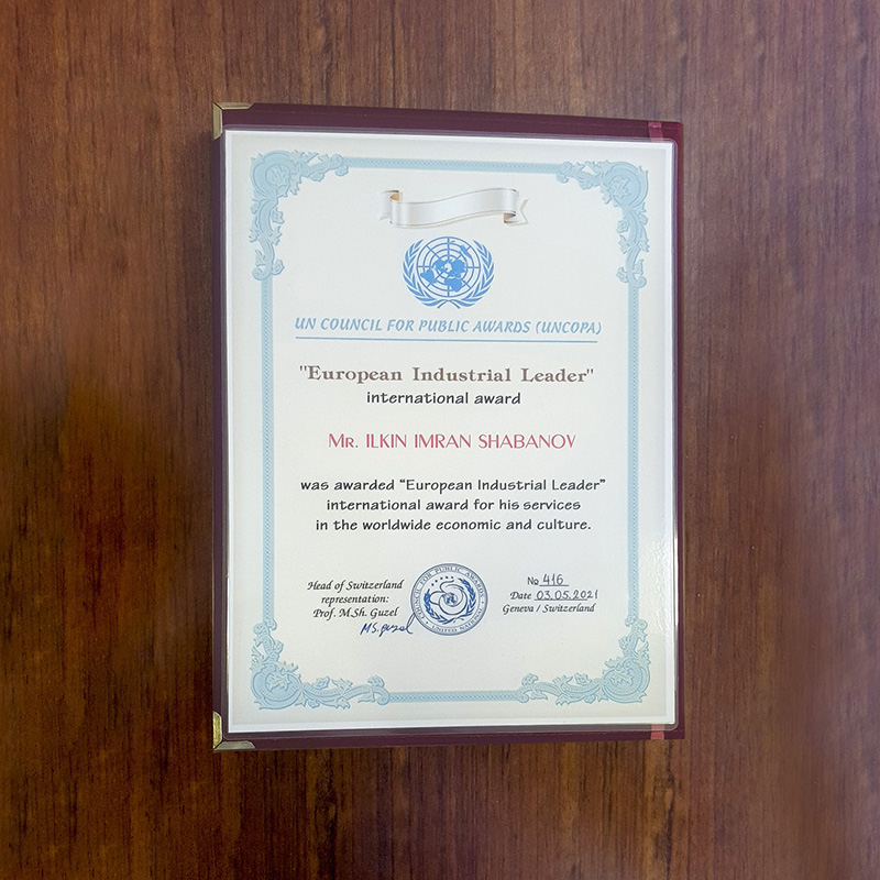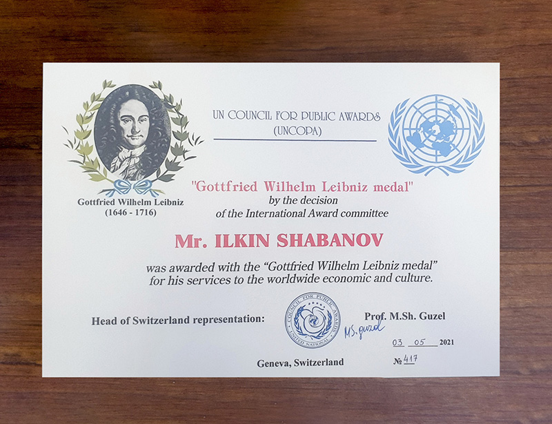 İsveçrənin Cenevrə şəhərində fəaliyyət göstərən “UN Council for Public Awards” (UNCOPA) təşkilatı özünün 03 may 2021-ci il tarixli qərarı ilə Şabanov İlkin İmran oğlunu ölkə iqtisadiyyatı və mədəniyyəti qarşısında xidmətlərinə görə “Avropa Sənaye Lideri” fəxri adı verilməklə “Gottfried Wilhelm Leibniz” medalı ilə təltif edib.
