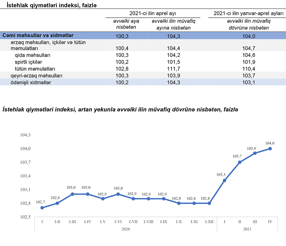 2021-ci ilin yanvar-aprel aylarında istehlak qiymətləri indeksi (inflyasiya) 2020-ci ilin yanvar-aprel aylarına nisbətən 4,0 faiz, o cümlədən ərzaq məhsulları, içkilər və tütün məmulatları üzrə 4,7 faiz, qeyri-ərzaq məhsulları üzrə 3,7 faiz, əhaliyə göstərilmiş ödənişli xidmətlər üzrə 3,1 faiz artıb. Dövlət Statistika Komitəsinin yaydığı məlumata görə, cari ilin aprel ayında istehlak qiymətləri indeksi əvvəlki aya nisbətən 0,3 faiz, əvvəlki ilin aprel ayına nisbətən 4,3 faiz yüksəlib.